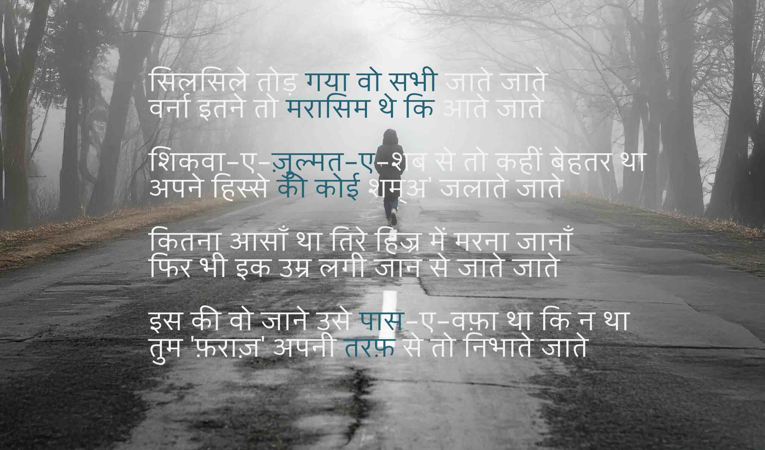 सिलसिले तोड़ गया वो सभी जाते जाते Gallery सिलसिले तोड़ गया वो सभी जाते जाते Uncategorized सिलसिले तोड़ गया वो सभी जाते जाते By Vishwas Gupta|2025-11-12T19:24:44+05:30April 20th, 2025|Uncategorized| A Stunning Ghazal by Ahmad Faraz Said so gently, yet [...] Read More 0